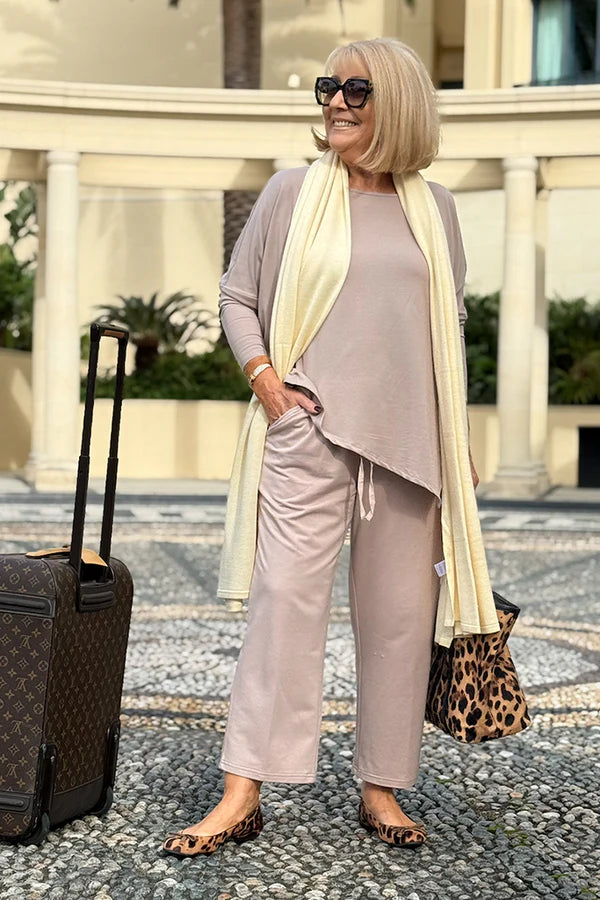 Elevate your wardrobe to a new level of comfort and sophistication with our Voyager Pants in Taupe! Designed with travel and relaxation in mind, these trousers feature a stretchy elasticated waistband and convenient side pockets for both style and practicality. Soft and comfortable, they are available in two lengths - petite and regular - and are designed to crop at the ankle for a chic, flattering silhouette. With a drawstring waist, you can cinch it in for a tailored fit or leave it relaxed for effortless ease.