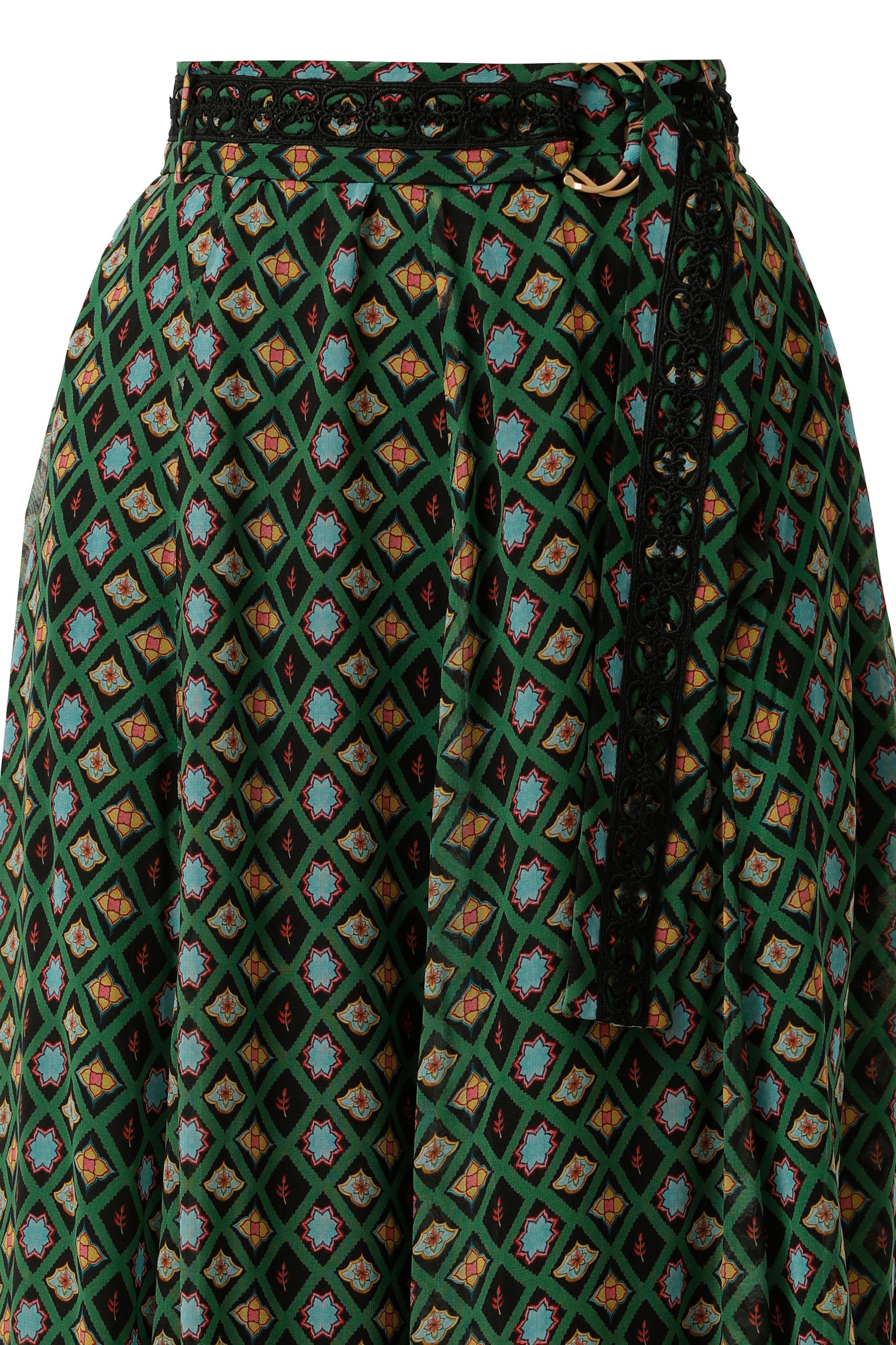 The skirt is voluminous at the waist. The waistband has a fabric belt with a contrast lace detail and is fastened with a gold metal D ring buckle.