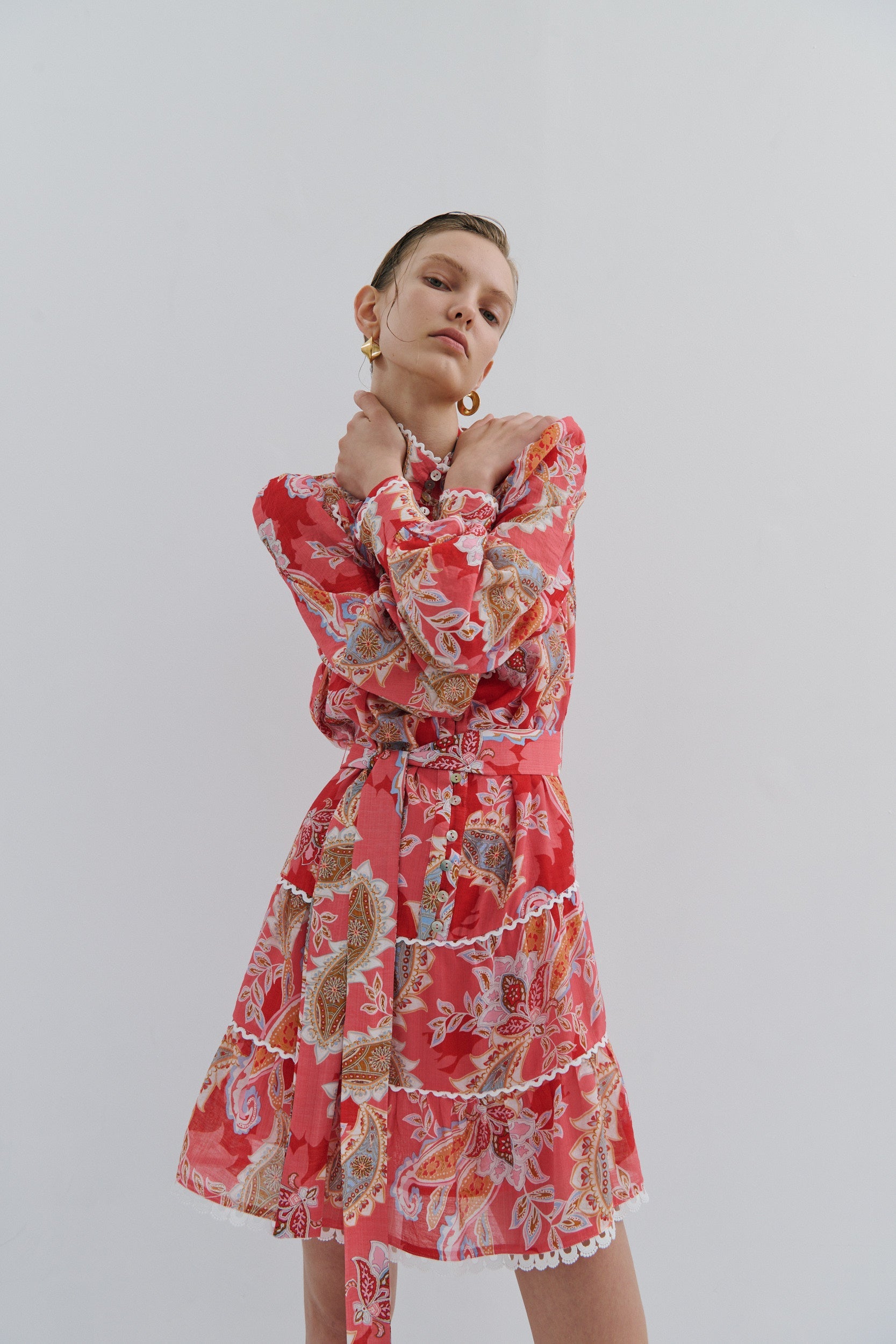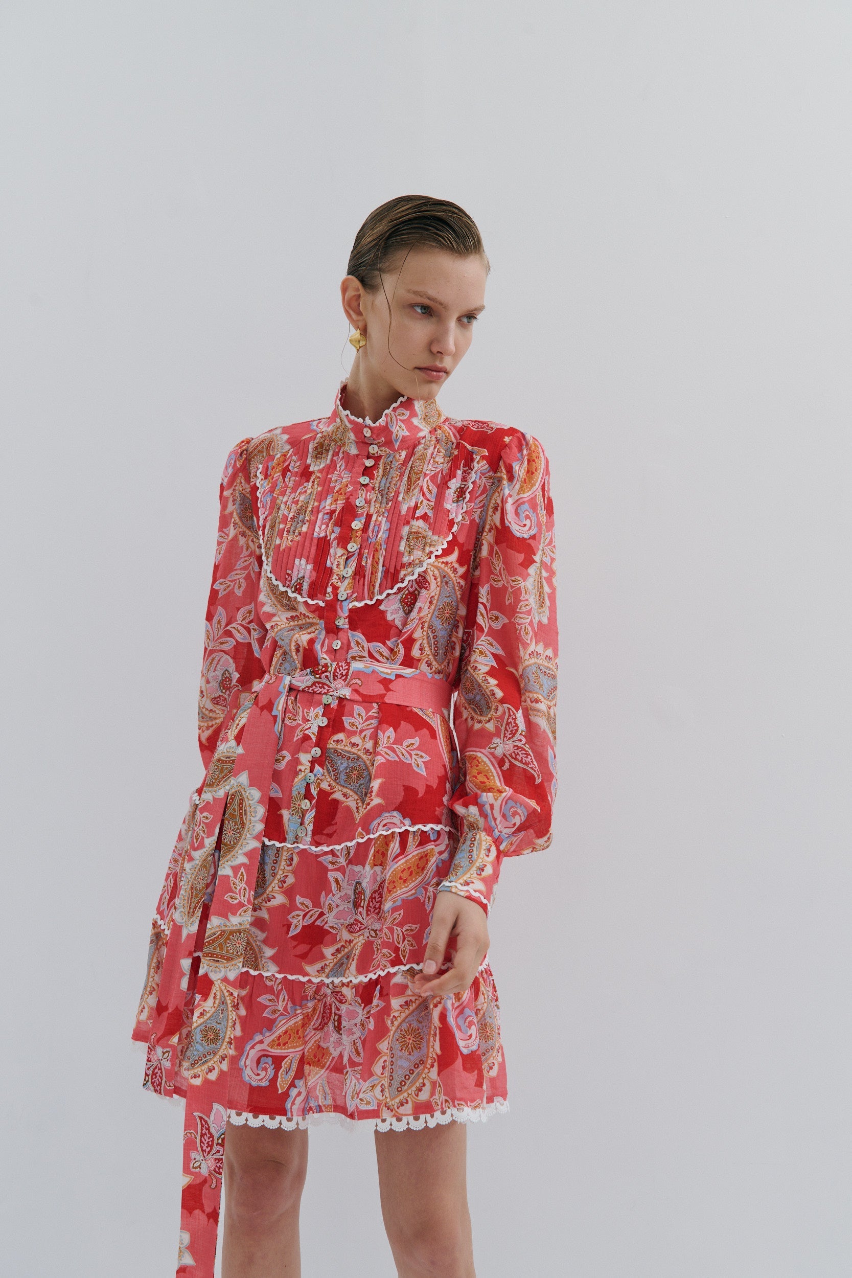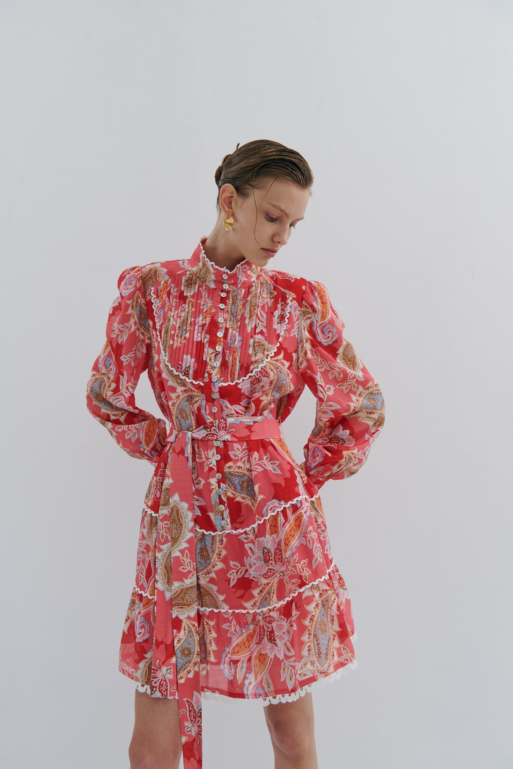 Embrace summer sophistication in this charming tiered mini dress, where feminine elegance meets playful allure. Crafted in coral and red tones, the dress features delicate heavy cotton lace trim that adds romantic texture and movement. The structured belt cinches the waist, defining your silhouette while the cascading tiers create a flattering, twirl-worthy shape. Perfect for garden parties, seaside gatherings, or warm-weather occasions where you want to feel effortlessly chic and undeniably captivating.
