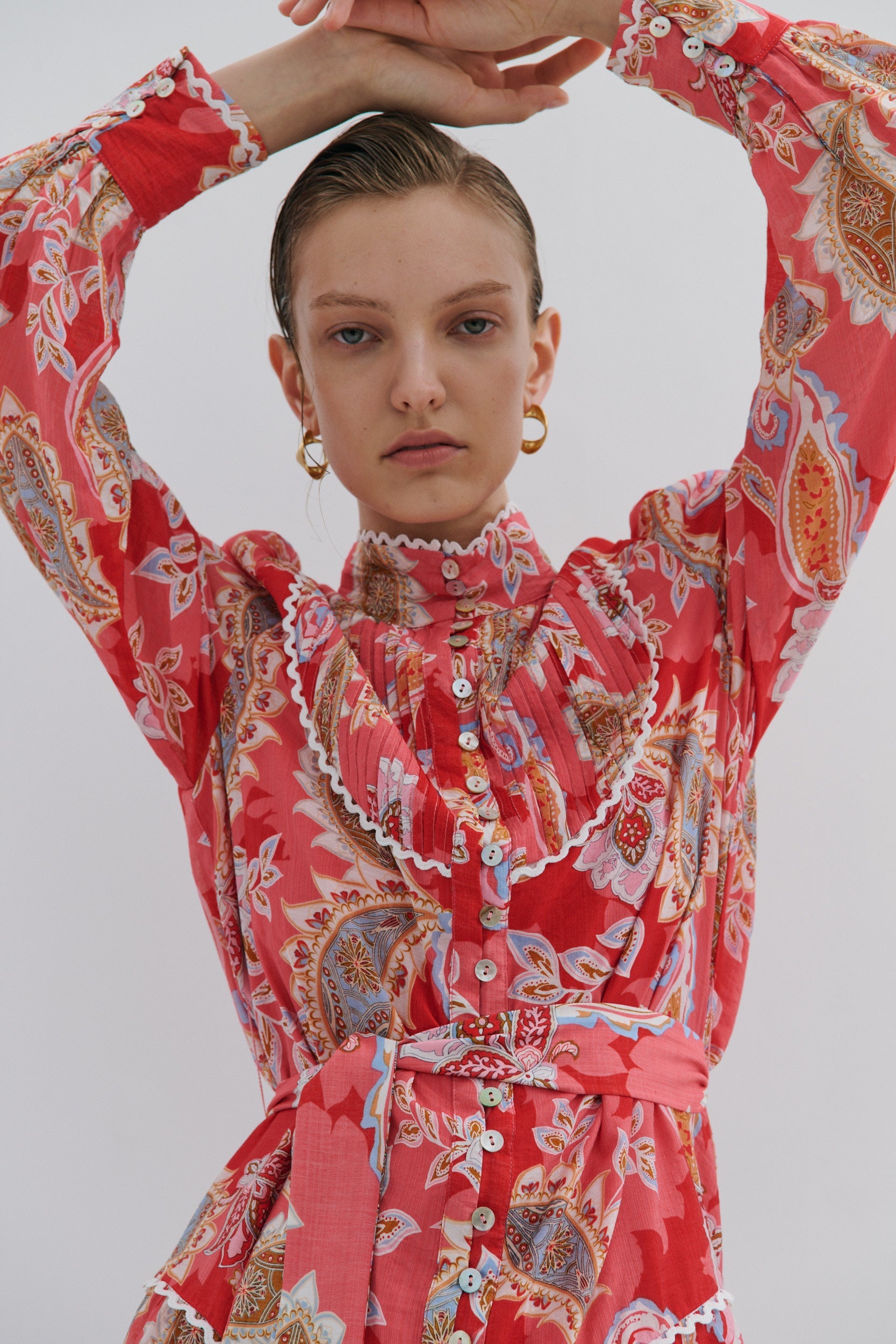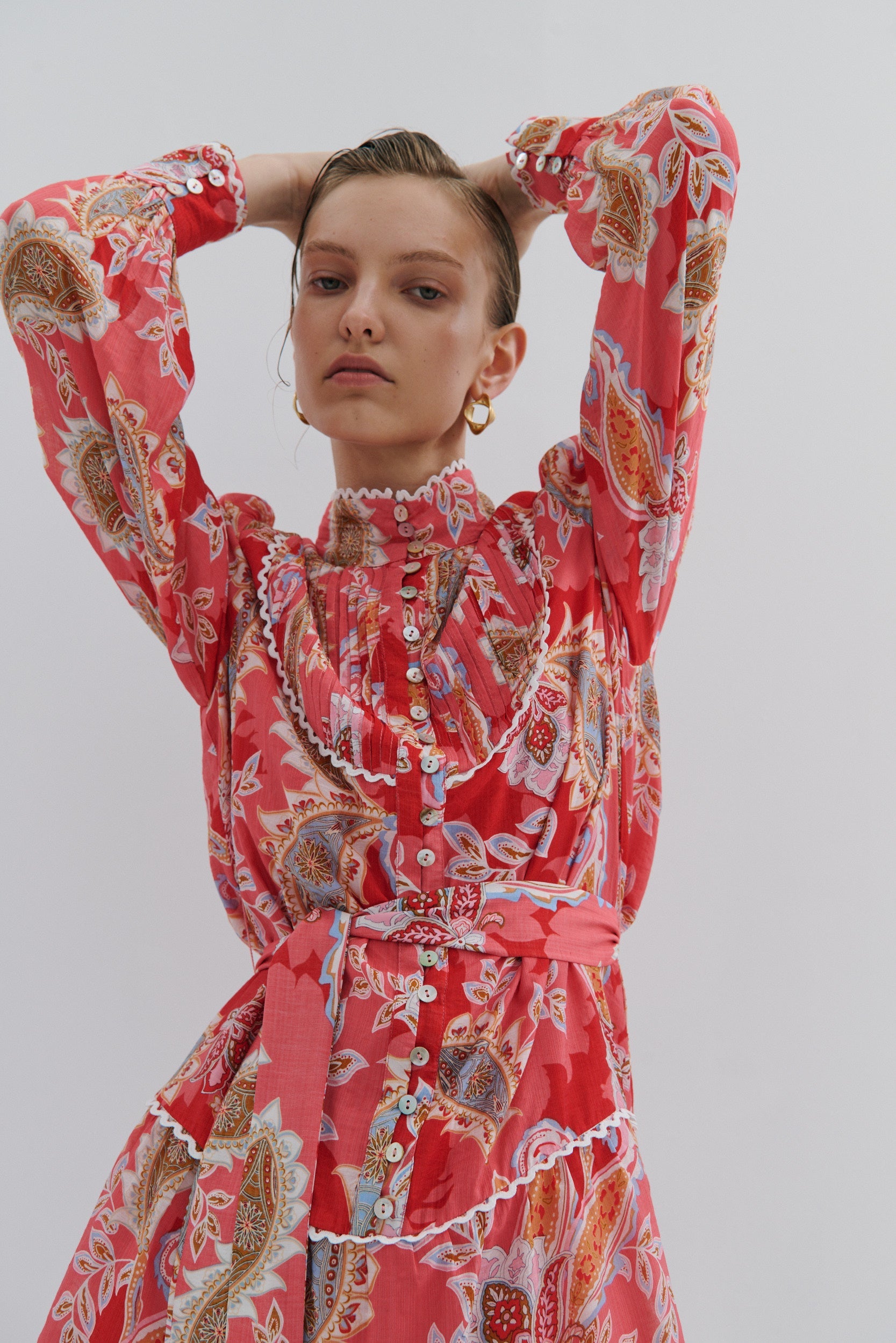 A stand collar with lace trim adds a soft, romantic touch.