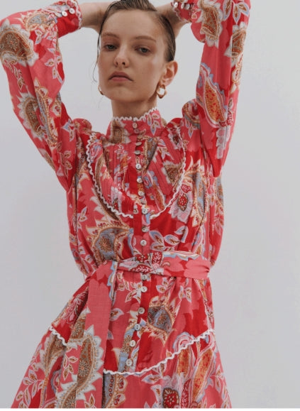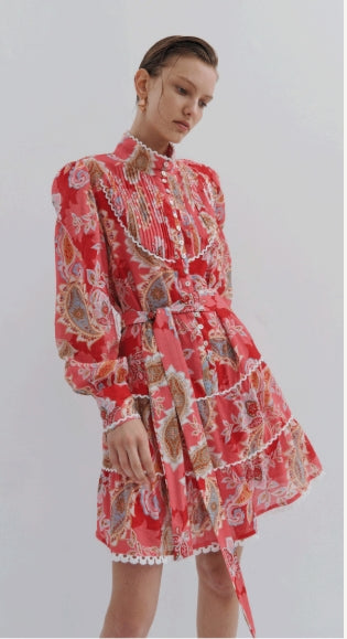 Embrace summer sophistication in this charming tiered mini dress, where feminine elegance meets playful allure. Crafted in coral and red tones, the dress features delicate heavy cotton lace trim that adds romantic texture and movement. The structured belt cinches the waist, defining your silhouette while the cascading tiers create a flattering, twirl-worthy shape. Perfect for garden parties, seaside gatherings, or warm-weather occasions where you want to feel effortlessly chic and undeniably captivating.