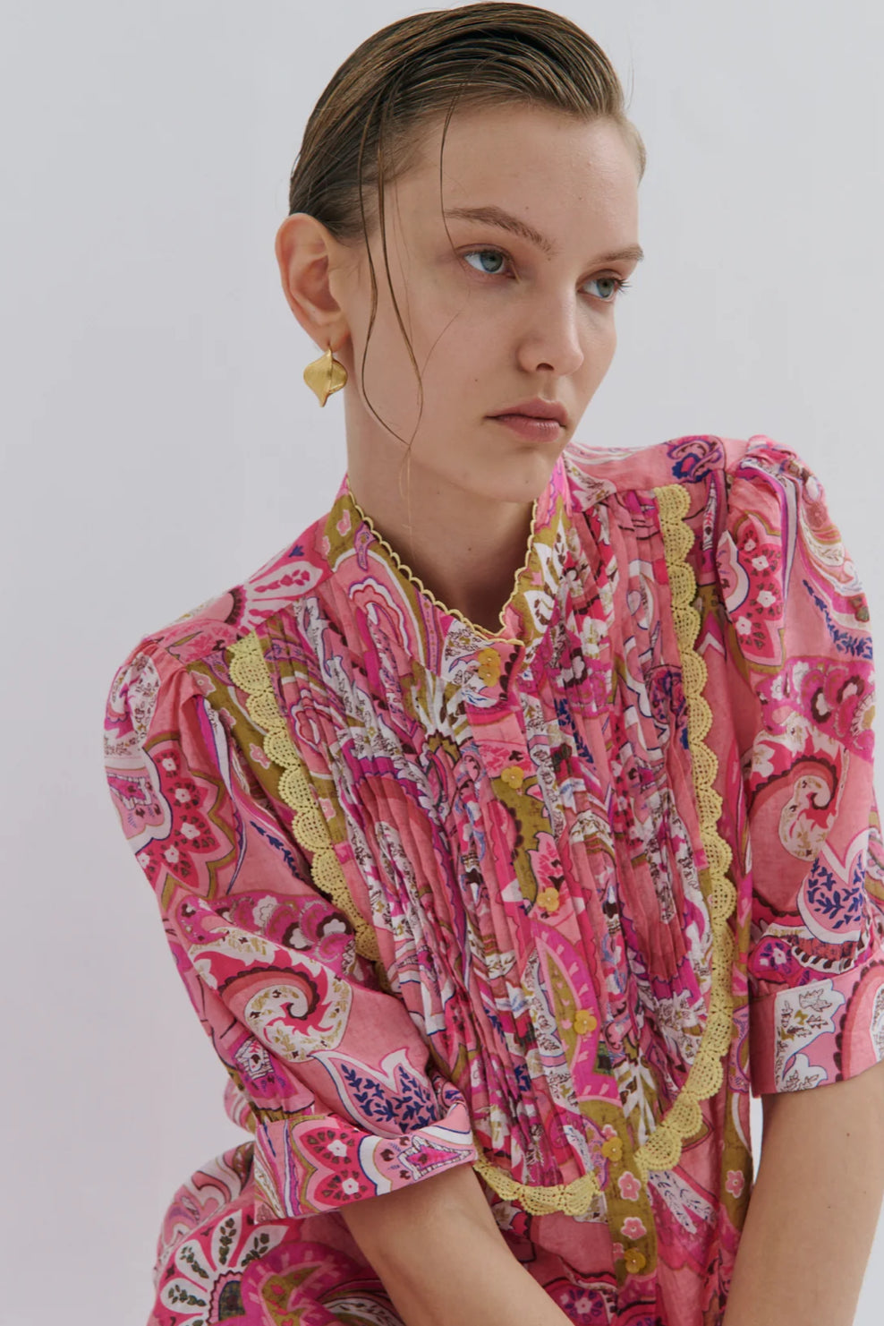 Features stunning blouson elbow-length sleeves, finished with relaxed cuffs and adorned with hand-dyed yellow lace trim. Delicate pintuck detailing, crafted by the most gifted artisans, adds a touch of wonder and elegance. Gentle A-line silhouette with a flattering length that falls just below the hips. Designed for versatile styling—wear it tucked in for a polished look or untucked for effortless charm. This piece is more than just a shirt—it’s a magical confidence booster. Immerse yourself in the craftsmanship through videos showcasing the intricate artistry behind every pintuck and lace trim.