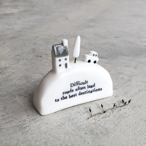 Porcelain Houses on the Hill - Difficult roads often lead to the best destinations. Part of East of India's collection of sweet trinkets to give to someone special or to buy for your home. There are different trinkets to choose from where either has a home with a tree on the hill or a couple of houses. Each trinket comes boxed with an illustration on the front, along with a sentiment of words or a saying.