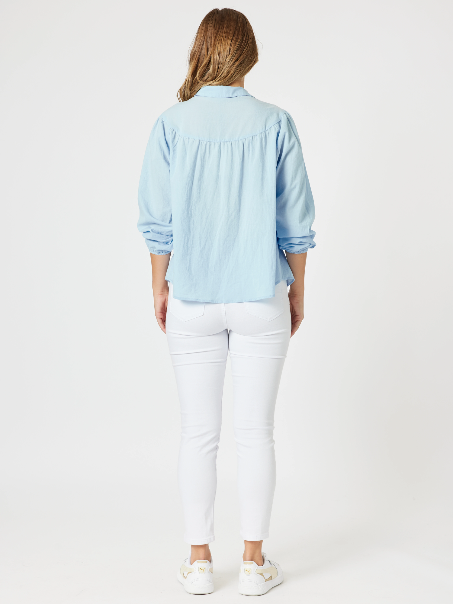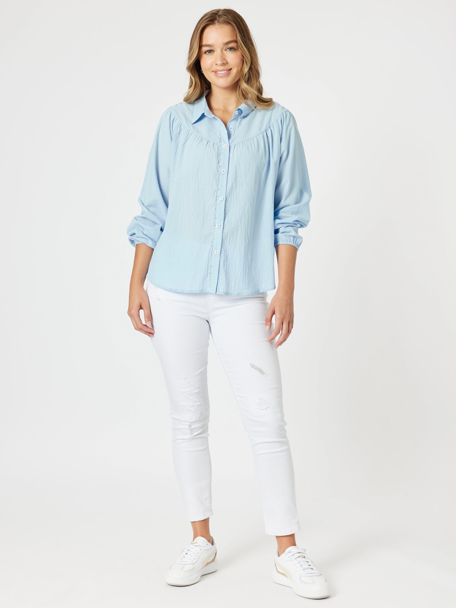 Add a playful pop to your wardrobe with the Crayon Stitch Shirt. Made from 100% cotton, this lightweight button-down offers a relaxed, breathable fit in a soft blue hue. Subtle gathers at the yoke add a touch of femininity, while the contrast crayon stitching along the placket brings a fun, distinctive detail. It’s perfect for styling tucked in, left loose, or layered over your favourite essentials