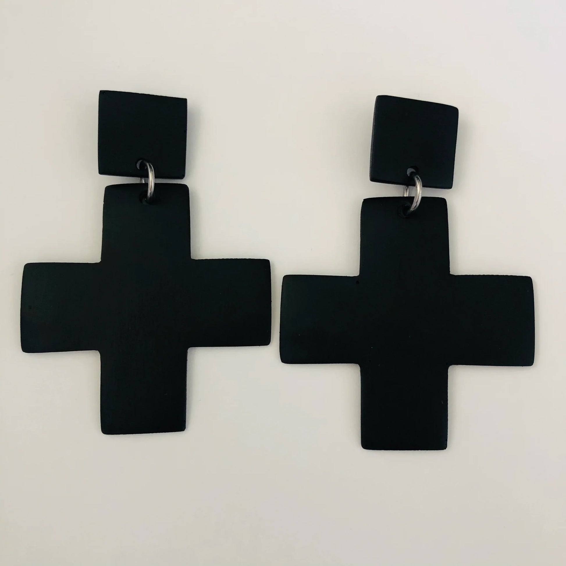 These stunning black cross earrings are sure to make a statement with their large size and statement-making design. Their bold size and unique resin material offer a one-of-a-kind look, while the matte finish adds a touch of sophistication. Measuring at 7.5cm in length and 5.5cm in width, these earrings will add a bold and edgy touch to any outfit.