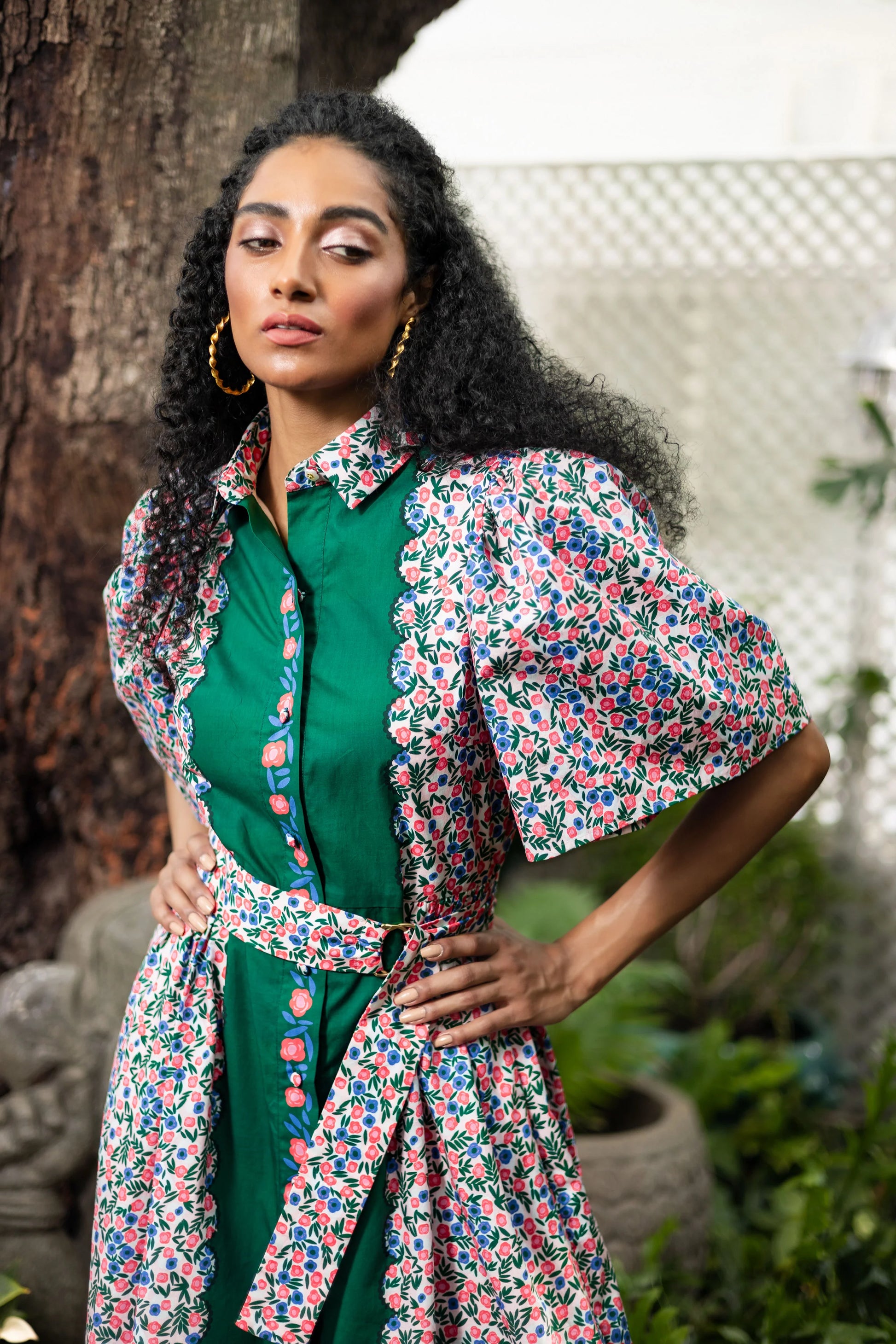 The Emily Lovelock Holly Dress is a striking belted midi dress featuring a vibrant veiled rose print with a contrast green panel down the front. Designed with statement puff sleeves and delicate scalloped edging, this dress exudes romantic femininity. The front button closure adds a classic touch, while the cotton-linen blend ensures comfort and breathability. A perfect choice for elevated daytime wear or a chic occasion outfit, this dress seamlessly blends vintage-inspired elegance with modern charm.