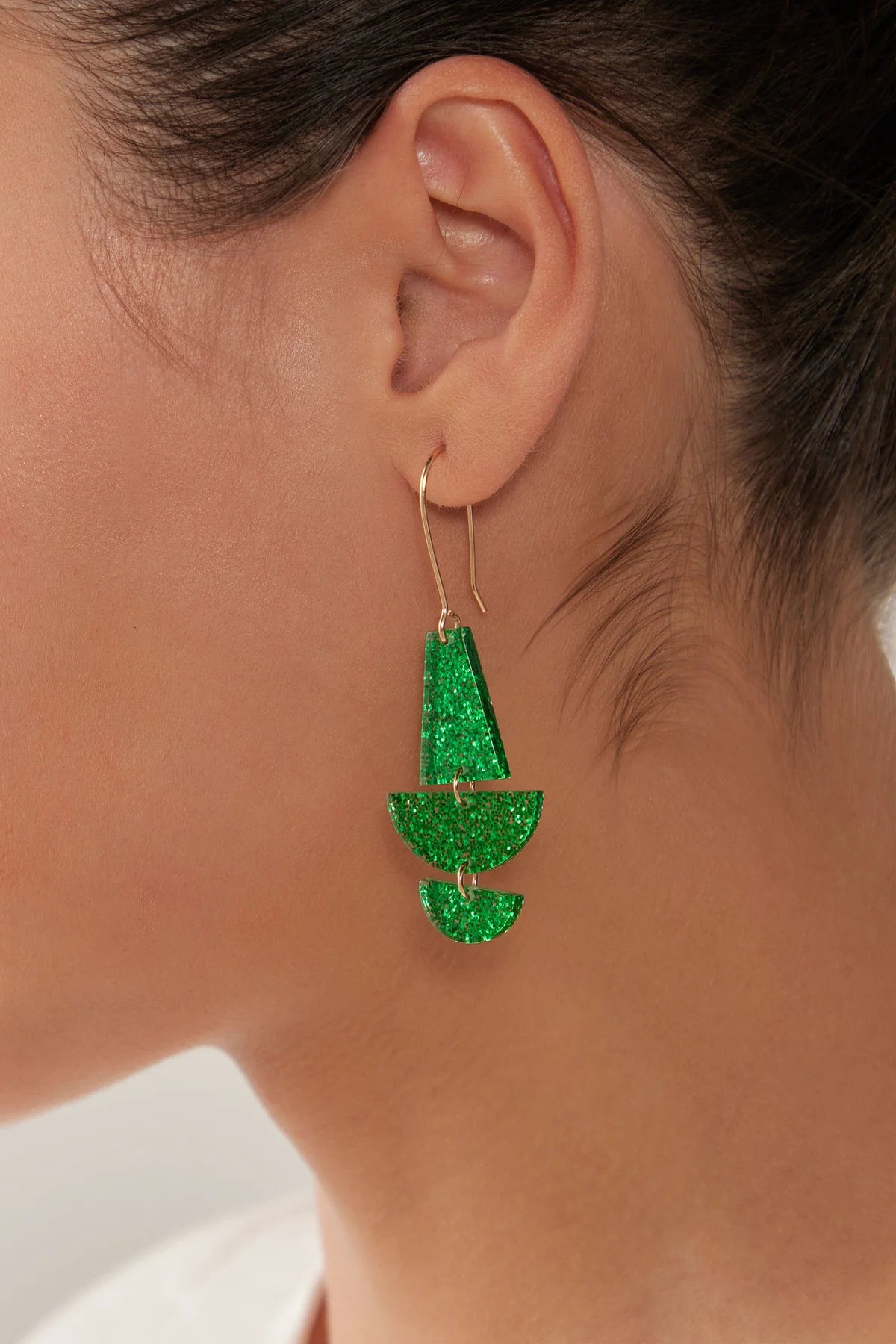 Featuring a playful semi-circle and polygon drop shape with embedded glitter. This is statement earring will add a touch of glamour to any outfit.