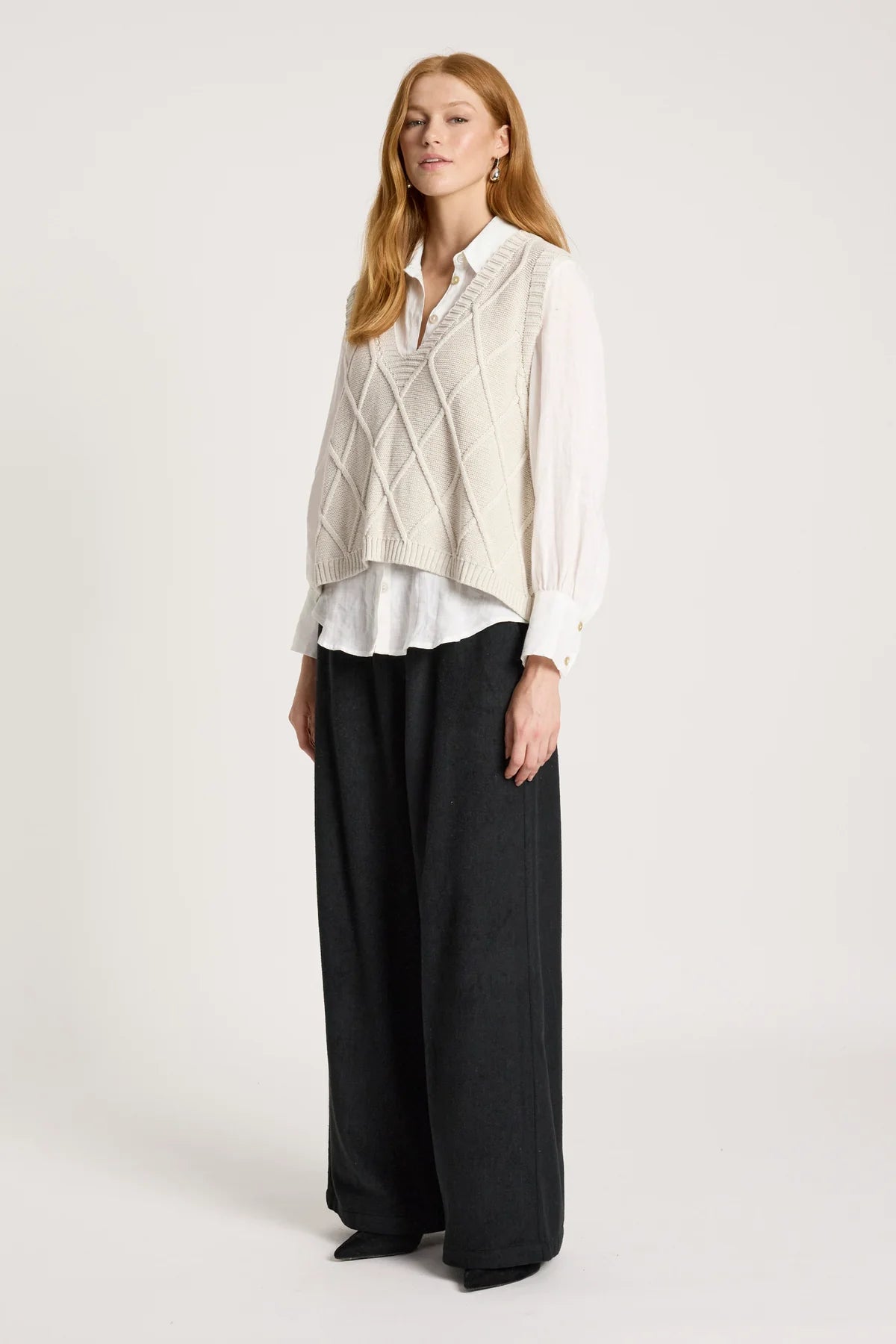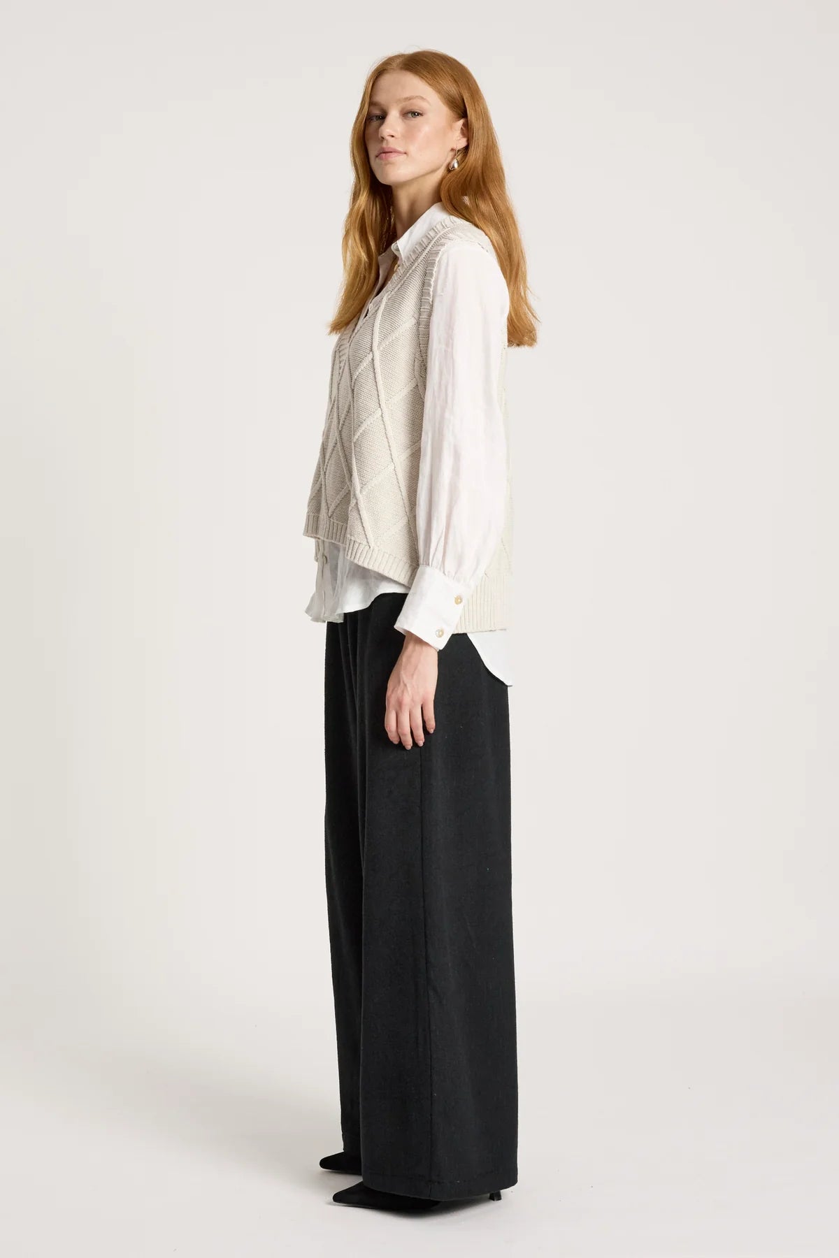 A classic V-neck knit vest with a modern twist. Crafted from breathable cotton, the Liora Knit Vest features a distinctive checkerboard knit and ribbed detailing. Designed for effortless layering, it adds depth and polish to everyday outfits.