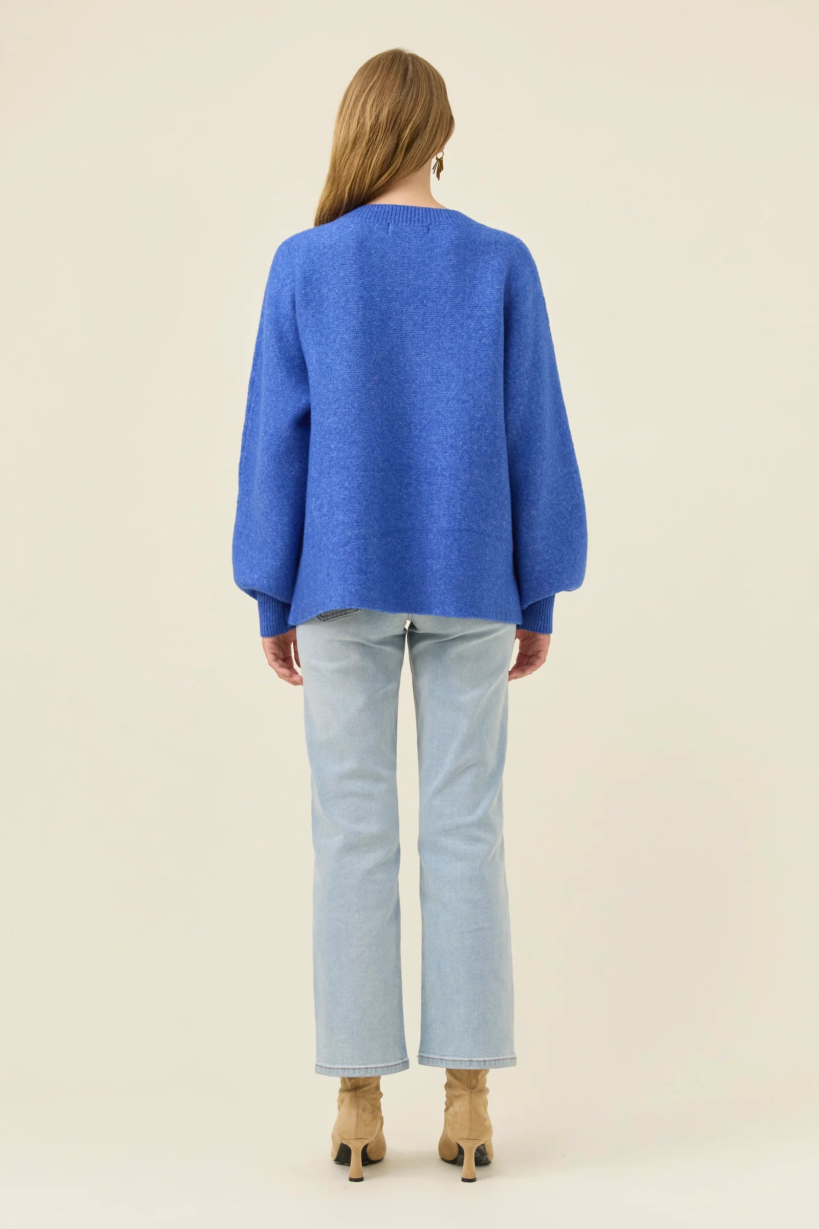 A cosy jumper with a playful stitched flower applique adding gentle charm to the silhouette. The crew neckline and relaxed fit keep it easy to layer, while the bishop sleeves bring soft volume.