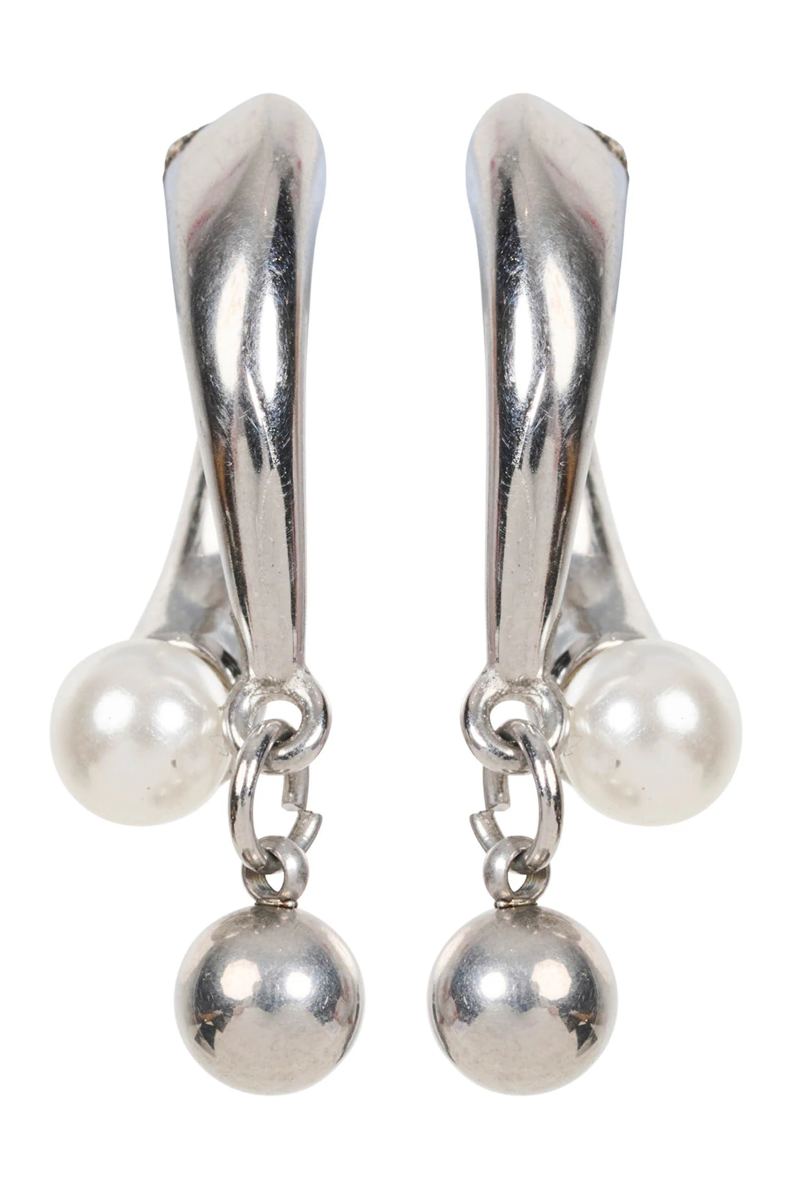The Oline Orb Earring Stack Pearl features a silver finish with a suspended imitation pearl and polished metal sphere. Pairs beautifully with linen shirting and soft tailoring.