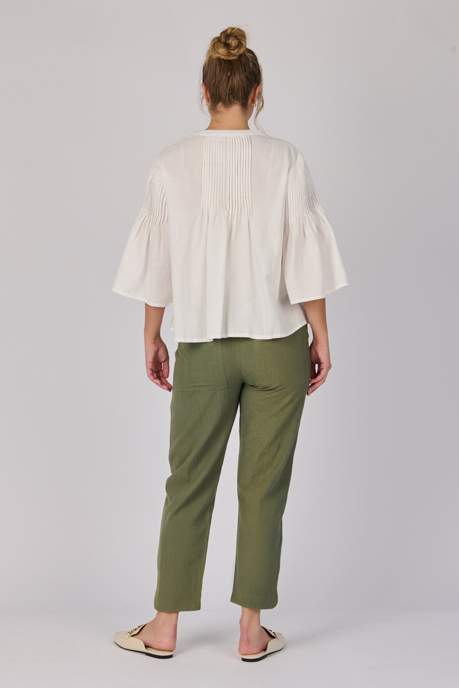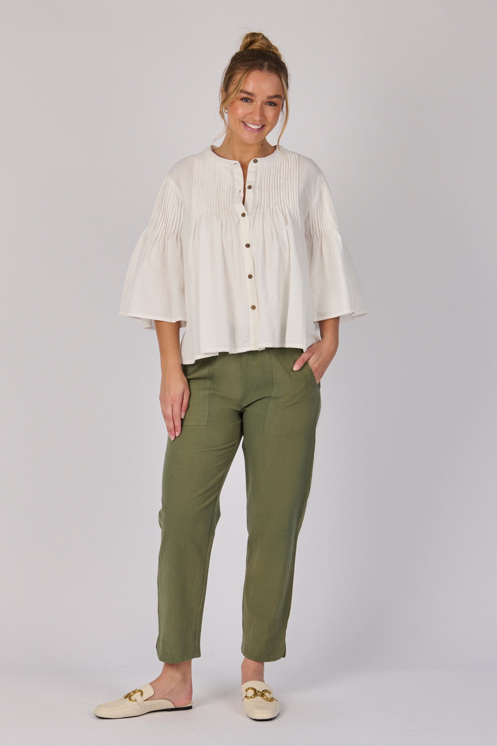 Elevate your everyday wardrobe with this refined pleat front blouse in a warm wheat tone. The structured pleating at the front adds subtle dimension and visual interest, creating a polished silhouette that transitions seamlessly from office to weekend. Crafted for comfort and style, this versatile piece pairs effortlessly with tailored trousers, skirts, or denim. A timeless essential that brings understated elegance to any occasion.